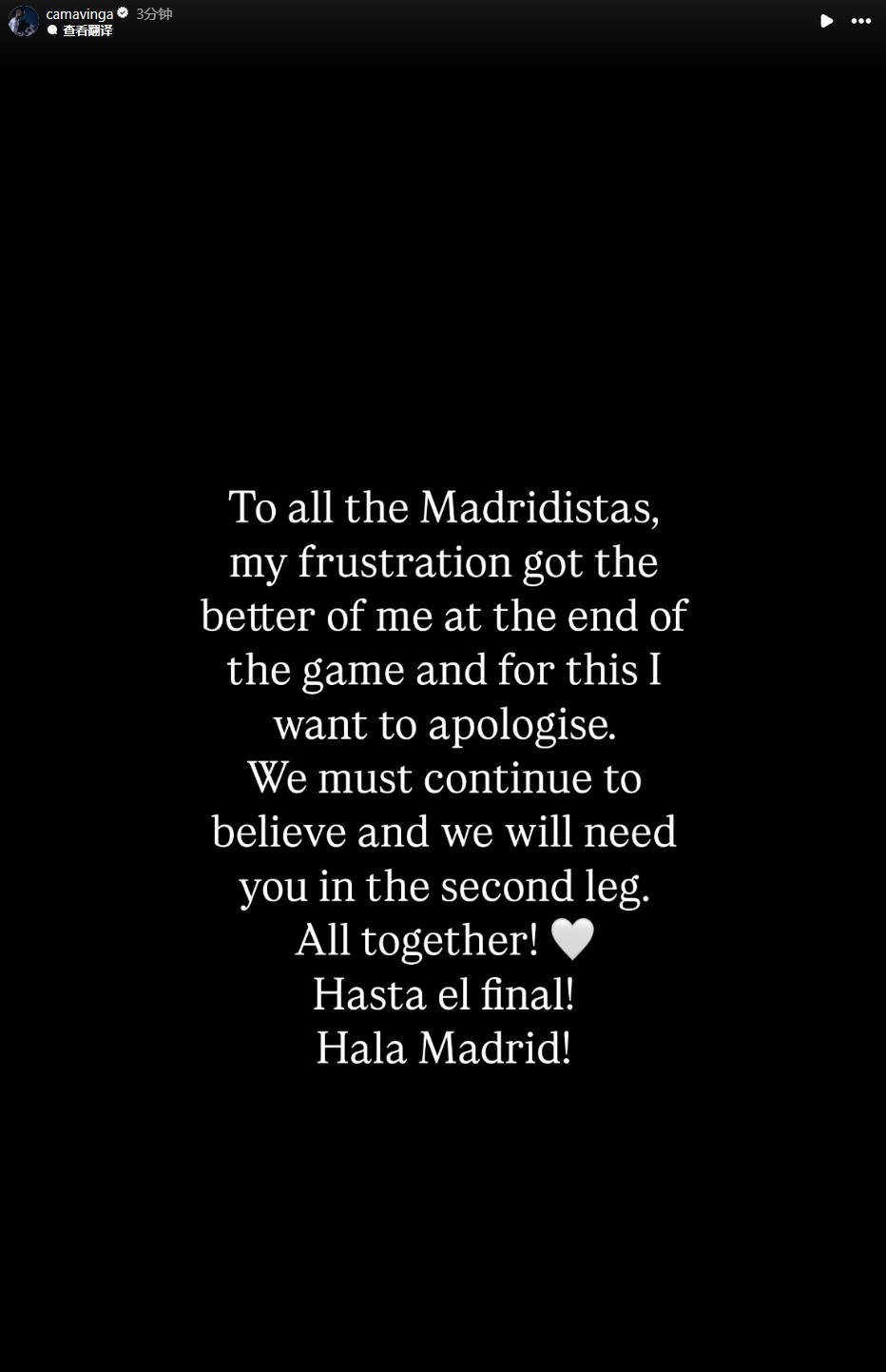 卡马文加写道:“致所有皇马球迷,在比赛结束时,我的情绪失控了,为此我想向大家道歉,我们必须继续相信自己,在第二回合中需要你们的支持,大家团结一致!直到最后!Hala Madrid!”