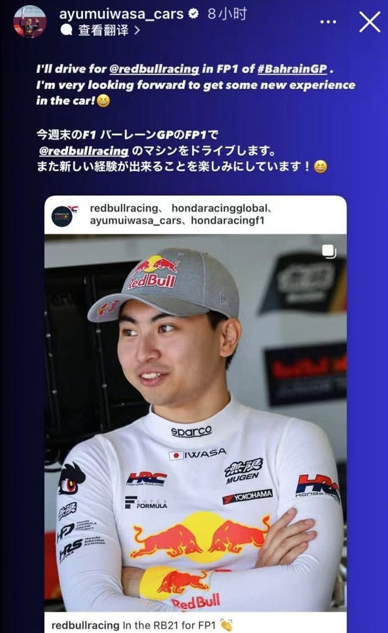 在巴林站将首次参加红牛车队的自由练习赛的岩佐步梦在社交媒体上表示:“我非常期待在赛车里获得一些新的体验!”