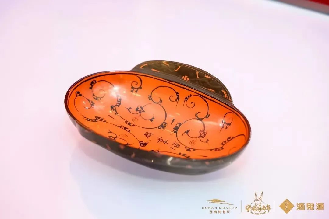 ▎长沙马王堆一号汉墓出土,“君幸酒”云纹漆耳杯。耳杯是战国至魏晋时期通用的饮酒器,斫木胎。外髹黑漆,内髹红漆,中部隶书“君幸酒”(意即“请用酒”)。图源@酒鬼酒