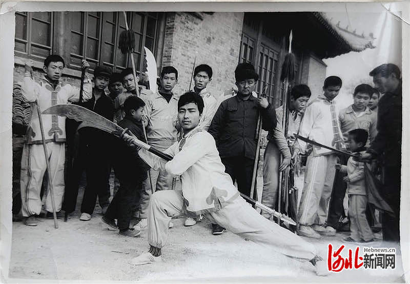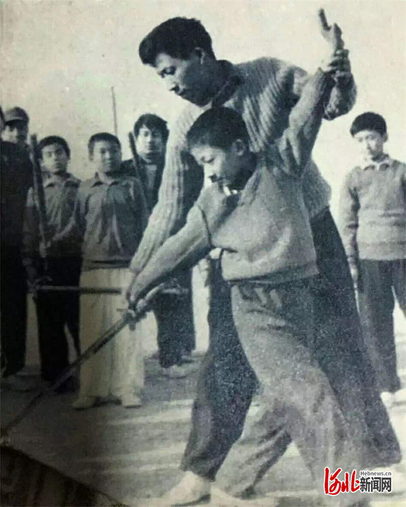 孟村八极拳第七代传承人吴连枝指导儿子吴大伟习练剑术。(摄于1980年) 吴大伟供图