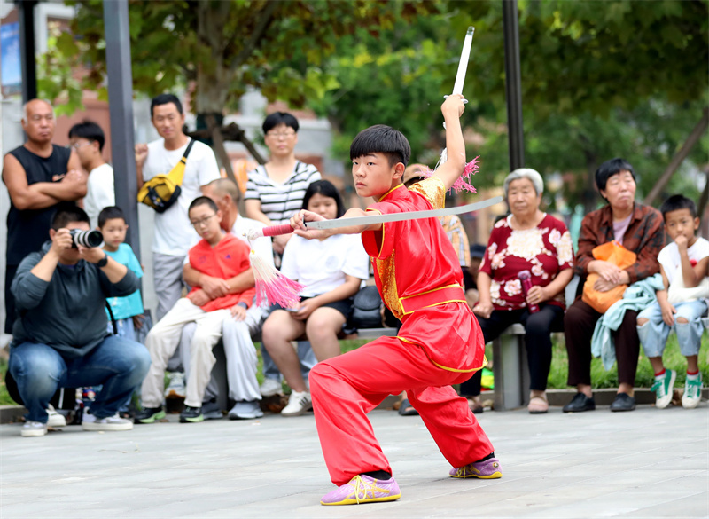 2024年9月8日,一名武术爱好者在沧州南川楼文化街区表演双剑。新华社发(周 洋摄)