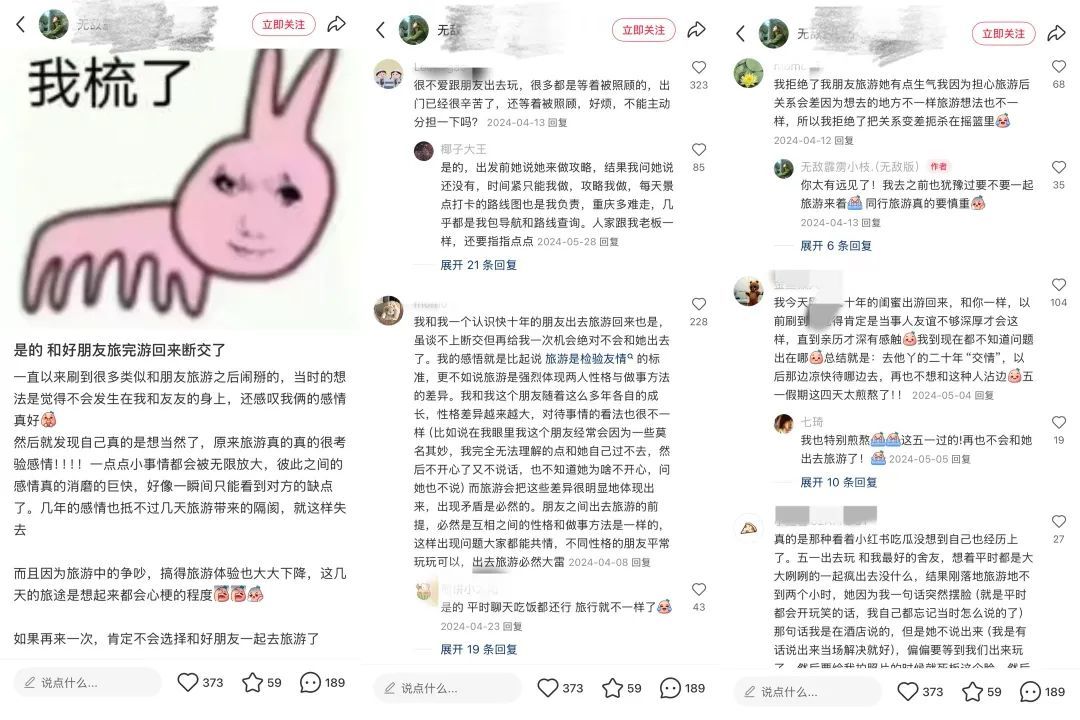 “是的,和好朋友旅完游回来断交了”这条笔记,189条评论印证了那条“朋友旅游必闹掰”的悲惨修罗场: