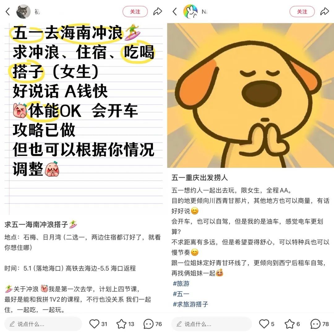 距离五一小长假不足一个月,清明假期刚结束没几天,小红书、抖音上已经有大量年轻人开始找“五一”旅游搭子了。
