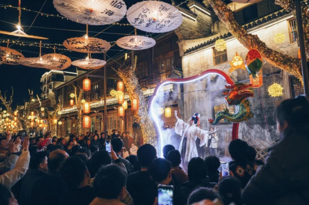 2)沉浸式文化项目: 街区通过沉浸式夜游项目(如《好事来临》实景演艺楼秀)和数字文化体验馆(如梅浦窑数字馆),融合激光灯效、情景表演与互动技术,打造多感官文旅场景。非遗主题展示馆利用数字化手段活化传统文化,常态化展演黄沙狮子、临海词调等非遗项目。