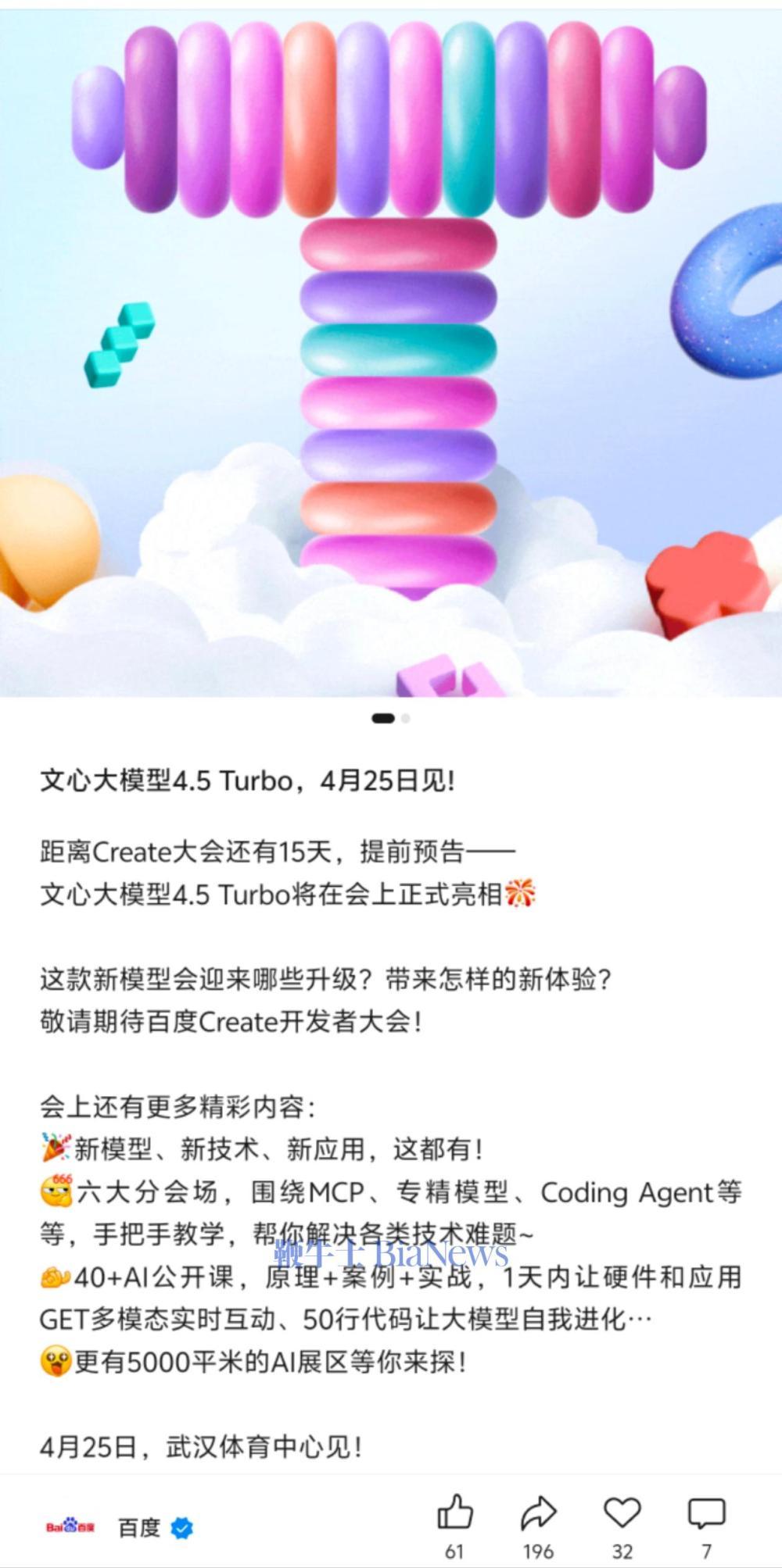4月10日,百度宣布,在4月25日举办的Create2025百度AI开发者大会上,文心大模型4.5 Turbo将正式亮相。