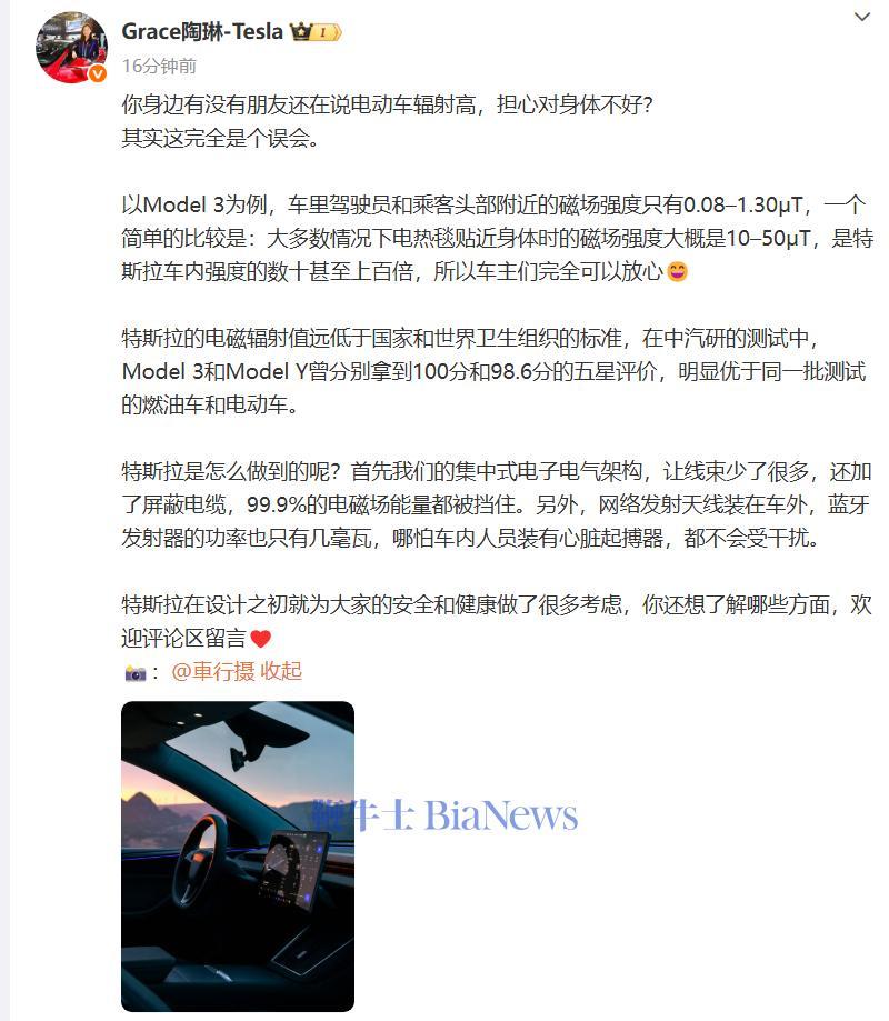 4月10日,特斯拉副总裁陶琳在微博回应了“电动车辐射高”的说法,表示这完全是个误会。