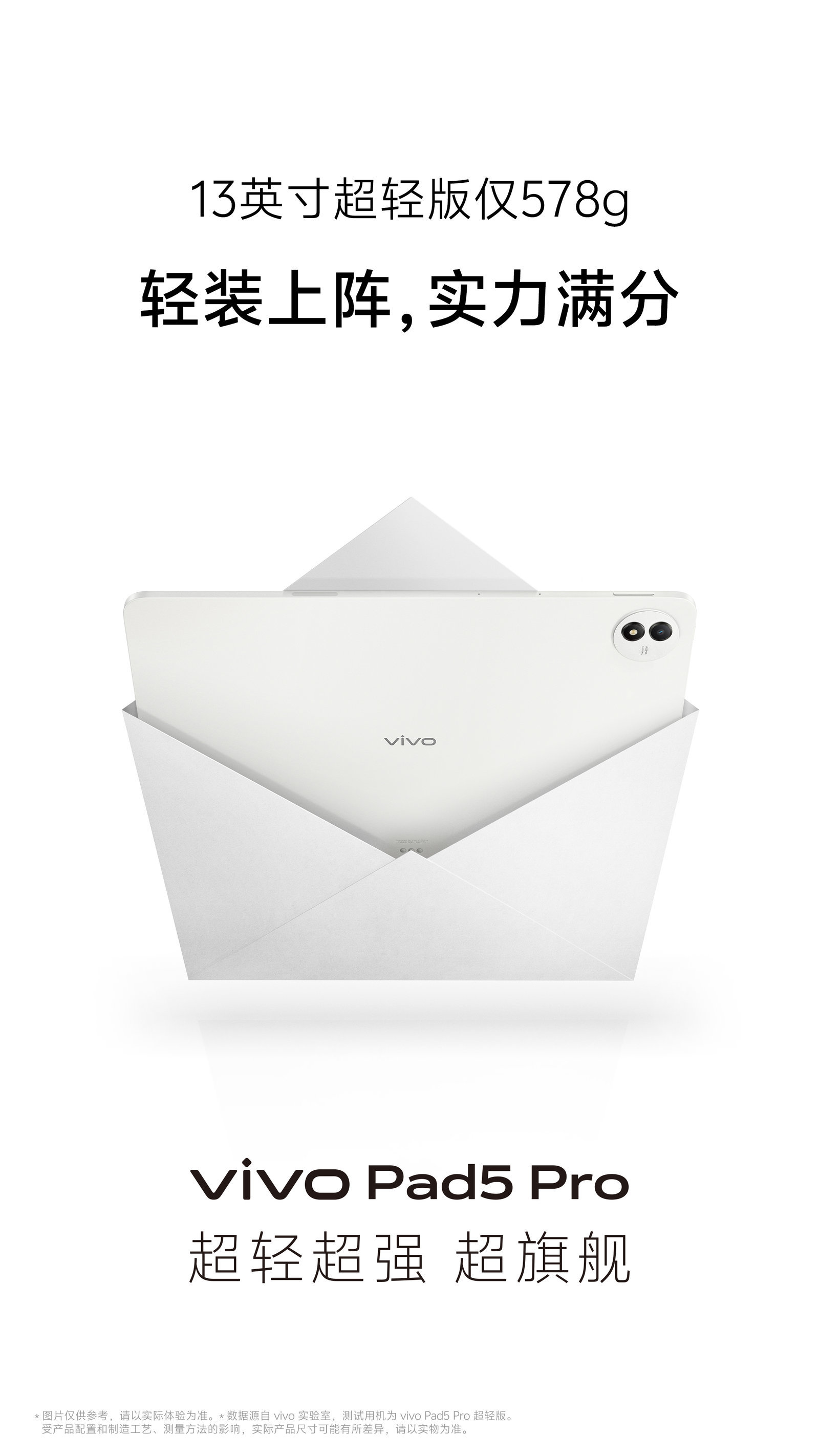 vivo Pad5 Pro 平板尺寸为 13 英寸、重量约 578g,将预装 OriginOS 5 HD 系统,支持 PC 级 WPS+AI 文档生产力。