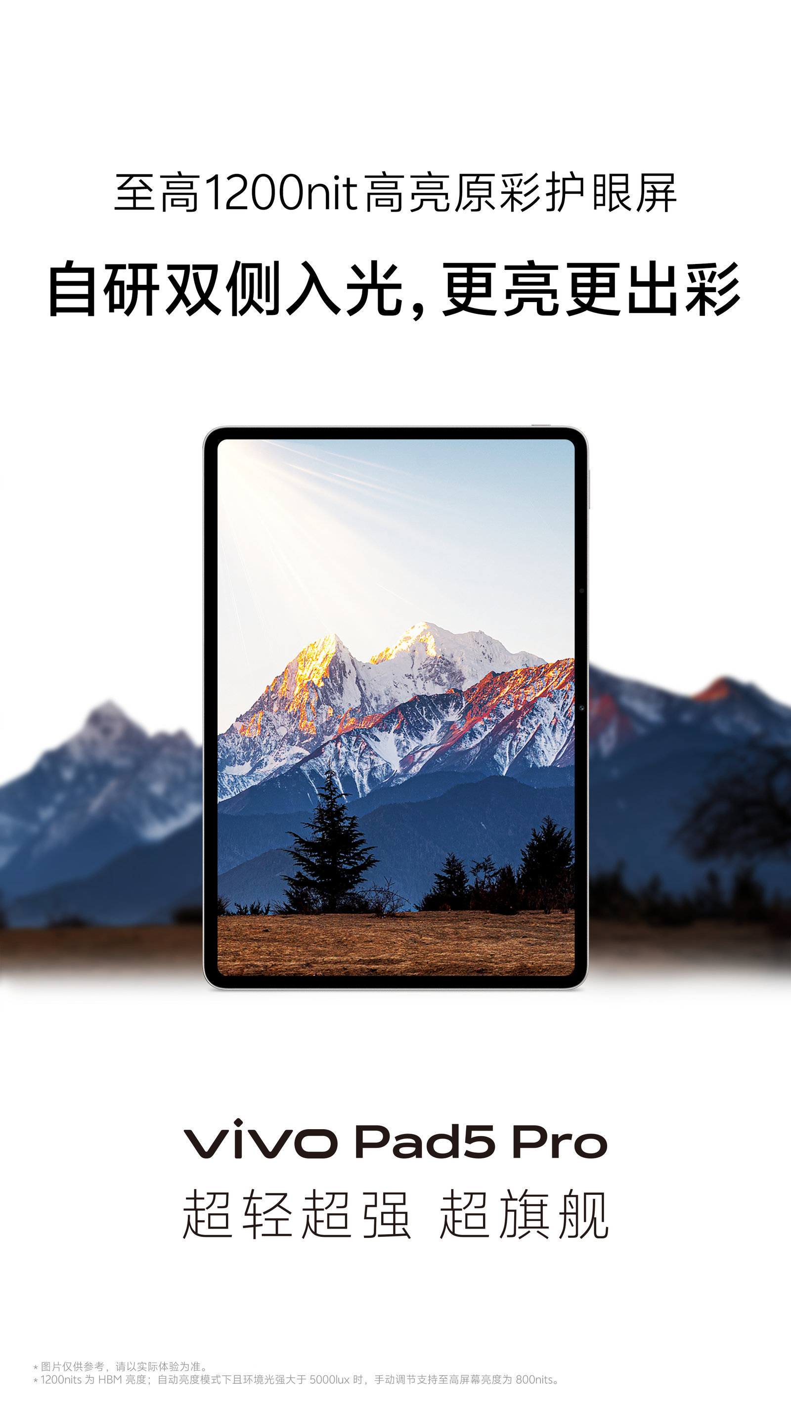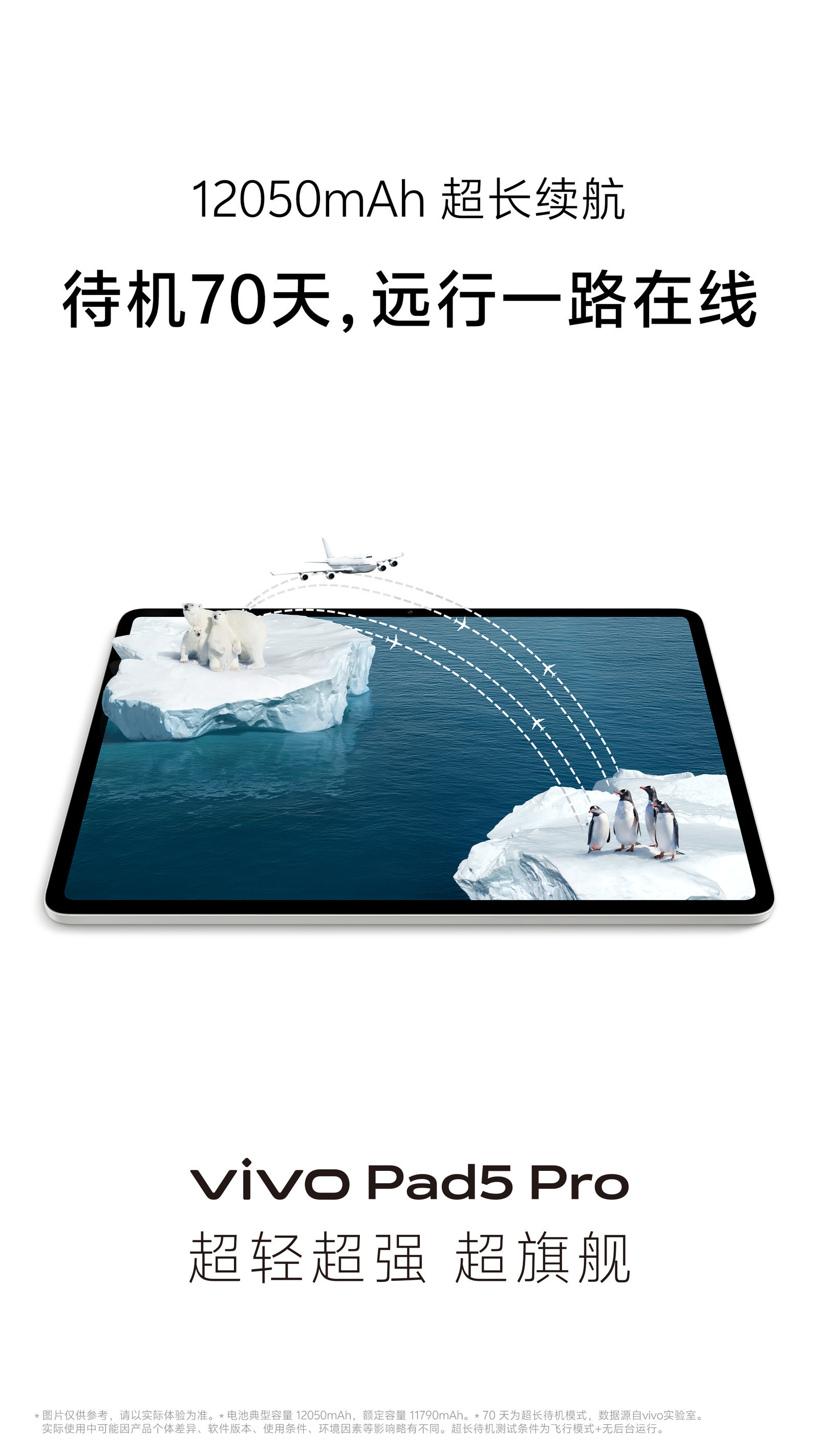 4 月 10 日消息,vivo官方放出 vivo Pad5 Pro 特点信息,将要在安卓平板全球首发"蓝晶 × 天玑 9400",1200nit 高亮原彩护眼屏,内置 12050mAh 超大电池,号称可以待机 70 天。