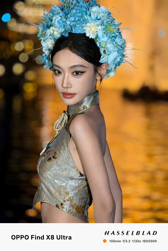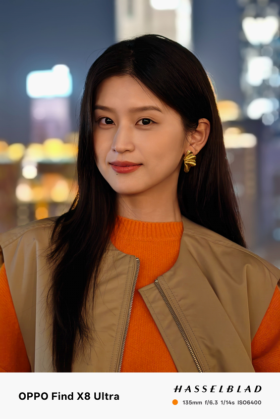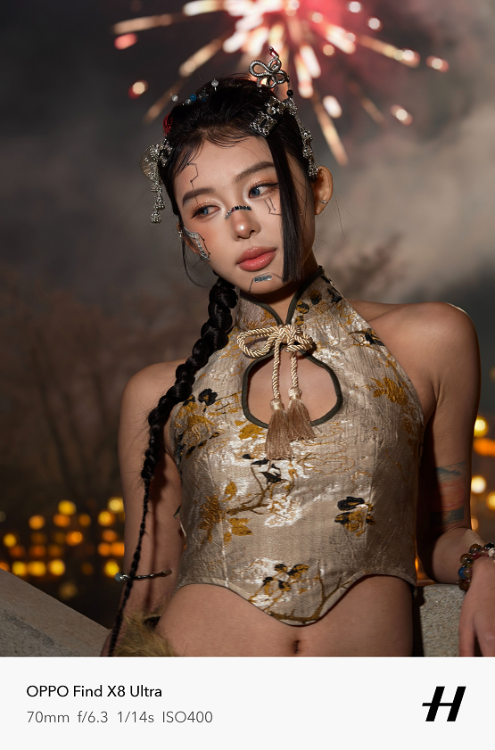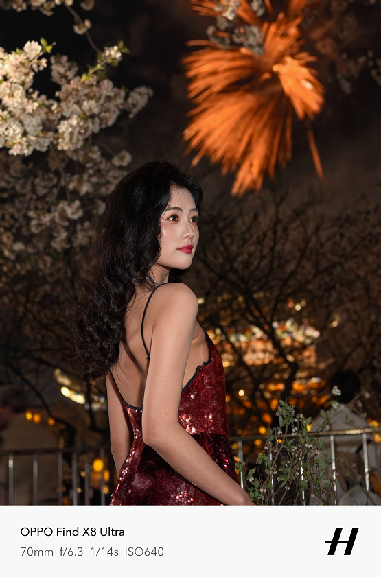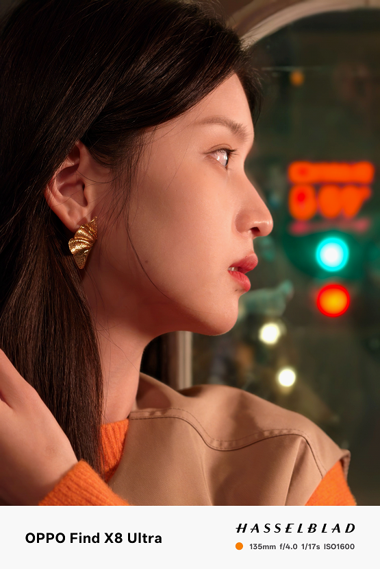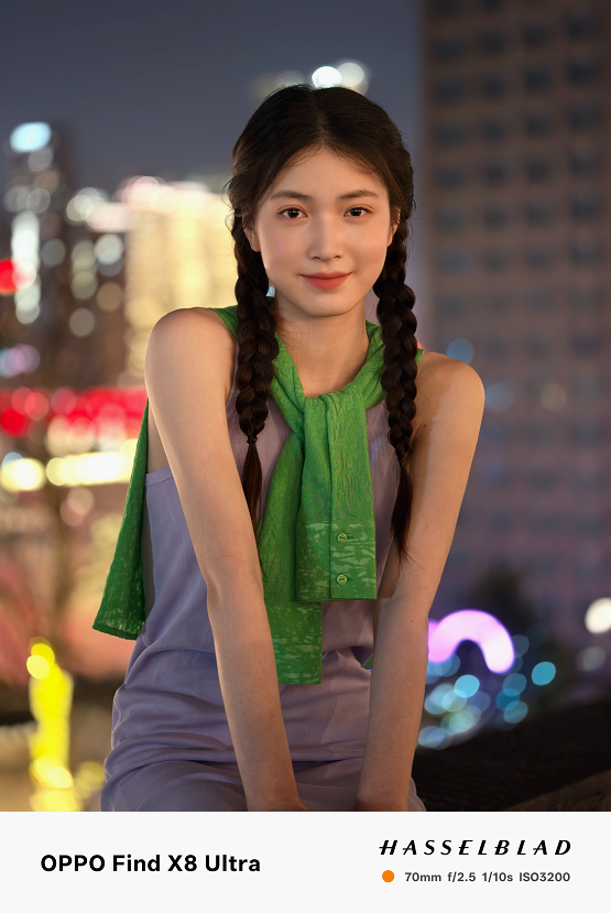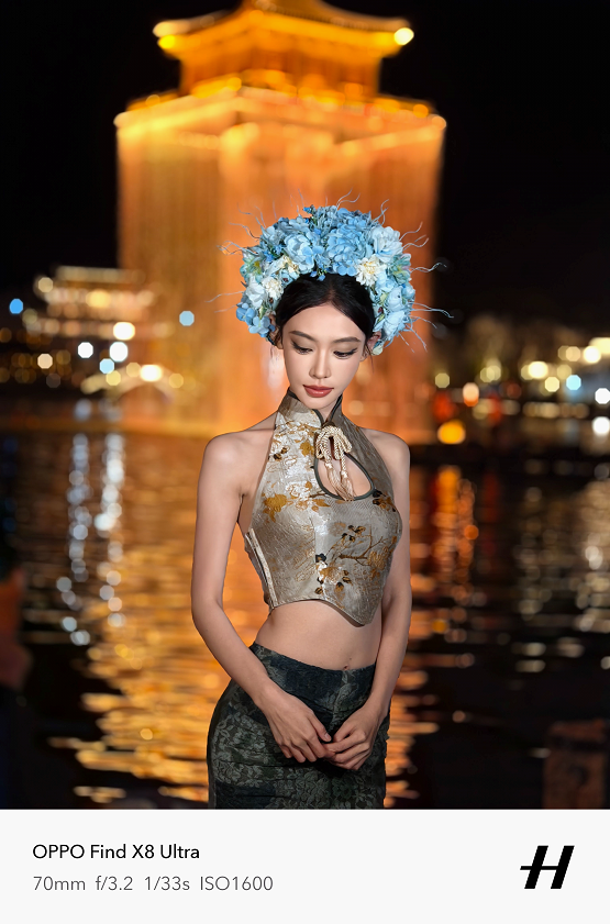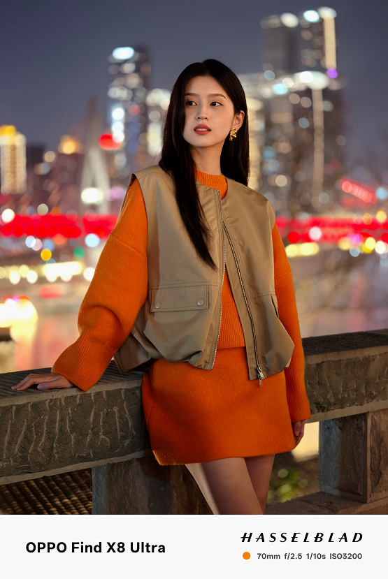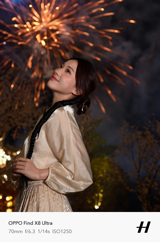 原生70mm焦段和无裁切5000万像素,让夜景人像拍摄清晰度远超以往。在实际拍摄中,天极网发现它在复杂夜景混合光线环境下,能精准还原人物主体肤色,避免了其他机型常见的人物肤色被环境光线染色的问题,人物面部几乎看不到环境光线的痕迹。Find X8 Ultra让肤色自然且充满气血感,恰到好处的眼神光,让小姐姐看起来更加可爱有活力。