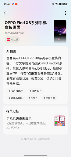 通过机身侧边全新的「快捷键」,用户可以一键启动AI闪记功能,它能够智能识别、分析并记录当前屏幕内的各种信息,并存储至「小布记忆」中。小布记忆不仅会集中管理重要信息,还会智能分类整理,通过智能标签和智能合集将信息自动归档到最佳位置,每一个记忆单元还有AI摘要,方便用户快速识别、分类、检索内容。当然,这颗物理按钮也支持自定义。