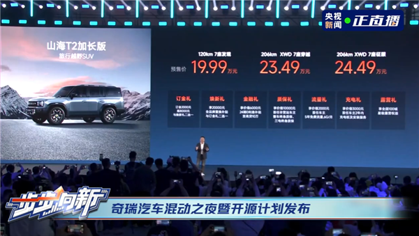 会上,捷途山海T2加长版正式开启预售,共推出3款7座版车型,售价区间为19.99万-24.49万元。