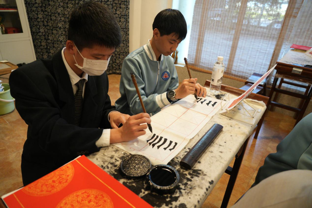 在书法教室内,北京八中学生刘承烨与来自台湾的新同桌并肩而坐。他说:“之前没接触过台湾同学,很好奇他们平时学什么、有什么兴趣爱好。”两人一边临摹对联“百舸争流花似锦,千峰竞秀水如银”,一边热络交流。刘承烨发现,这位台湾朋友同样热爱游泳和乒乓球,彼此毫无距离感。