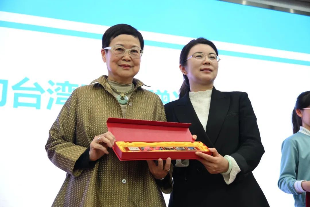 活动现场,北京八中向台湾师生赠送“诗礼传家久,炎黄一脉长”书法作品,台湾嘉宾回赠锦旗和典籍。