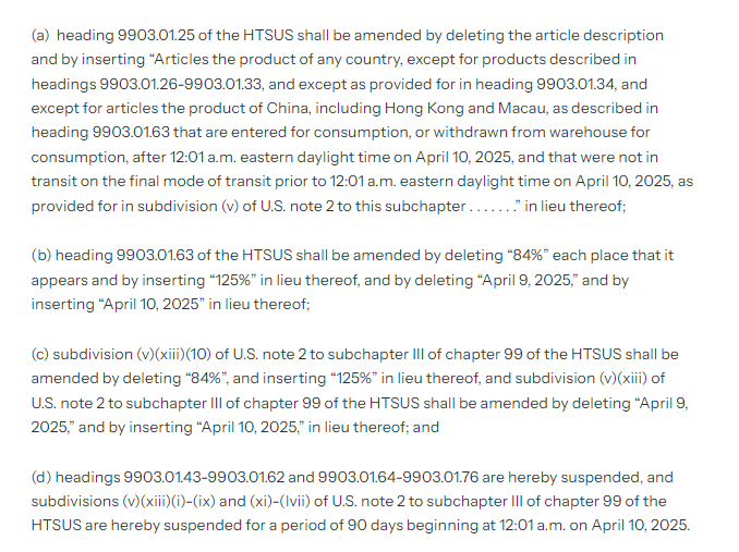 •将对中国加征的“84%”关税修改为“125%”;