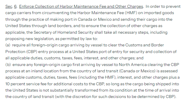 (b)确保任何通过船舶首先抵达北美的外国原产货物,在从陆路过境国(加拿大或墨西哥)的内陆地点清关通过美国海关及边境保卫局(CBP)时,都应缴纳适用的关税、税款、费用(包括HMF)、利息和其他费用,外加10%的服务费作为CBP的额外费用,只要运往美国的货物与抵达陆路过境国时的状态没有发生实质性变化(CBP可自行决定是否作出此类决定)。