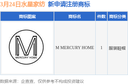 证券之星消息,根据企查查数据显示,近日上海水星家用纺织品股份有限公司新提交“M MERCURY HOME”商标注册申请。商标申请详情如下: