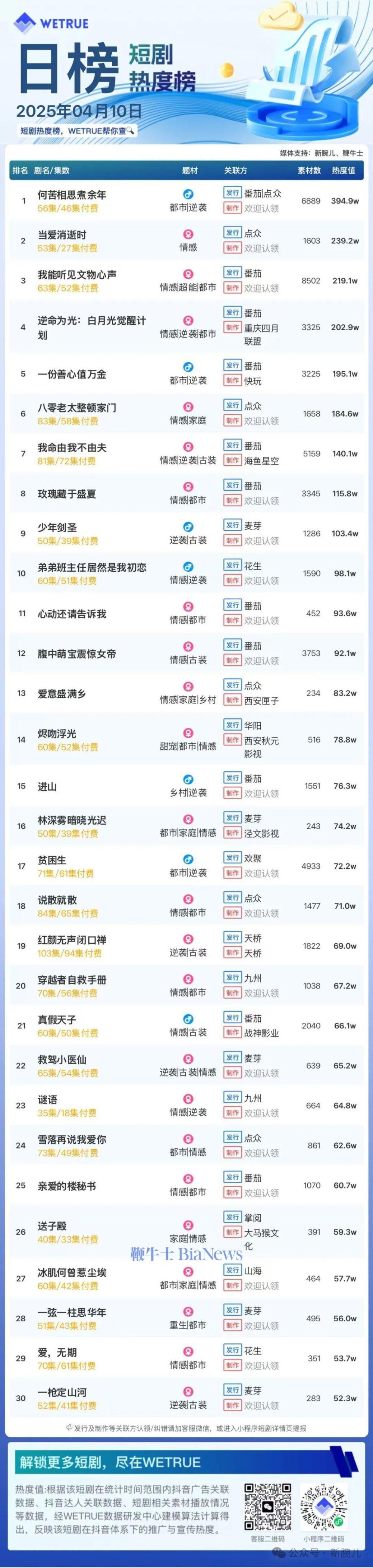 1、本日榜为WETRUE短剧数据公司提供,新腕儿和鞭牛士提供联合支持。