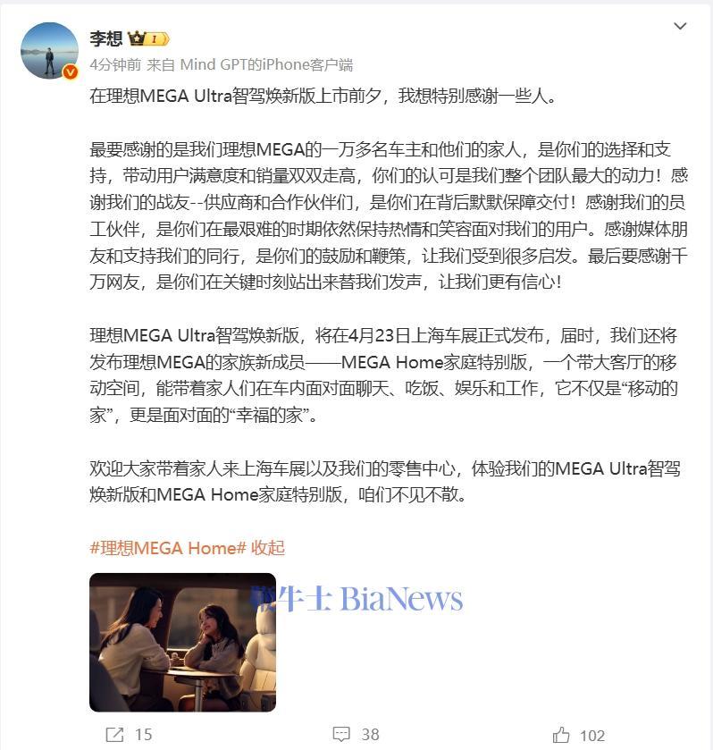 4月11日,李想在微博发文称,在理想MEGA Ultra智驾焕新版上市前夕,想特别感谢一些人。