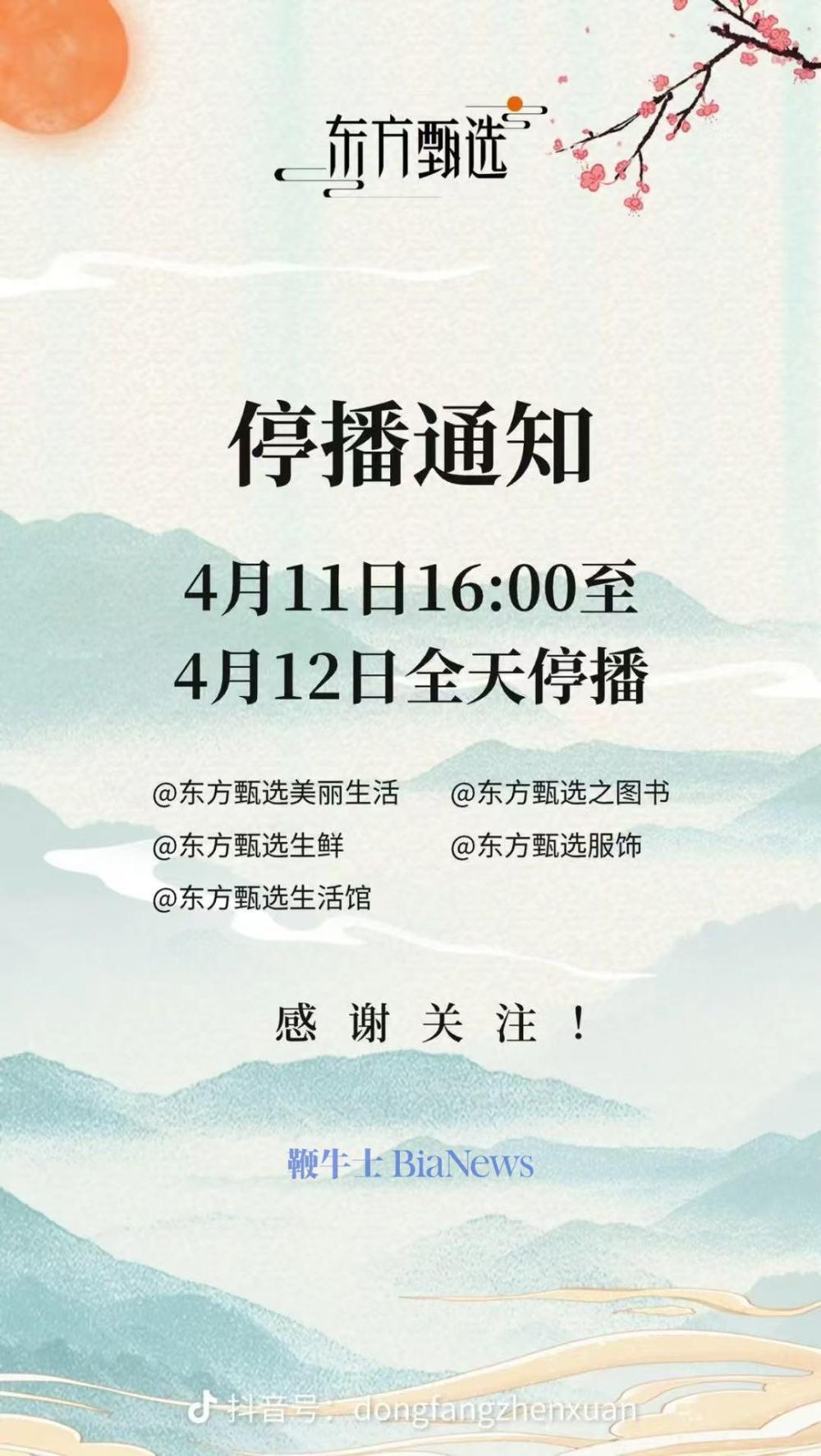 4月11日,东方甄选发布停播通知,4月11日16:00至4月12日全天停播。