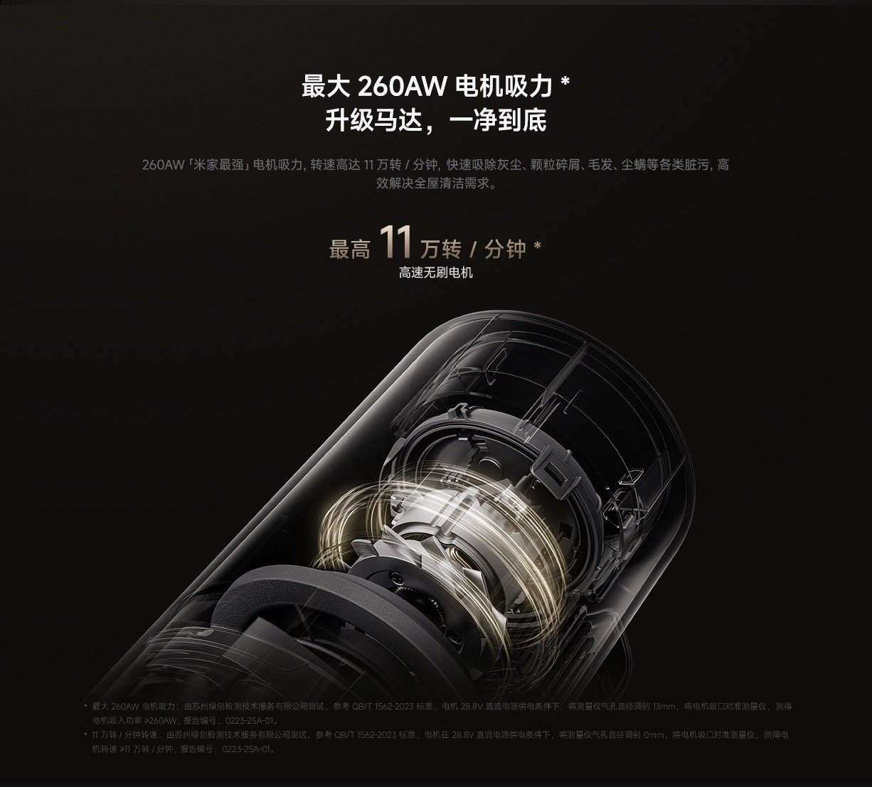 在吸尘器本体方面,米家无线吸尘器 3 基站版搭载了最高 11 万转/分钟的高速无刷电机,可以提供最高 260AW 的电机吸力,还有 12 锥气旋过滤系统,可以做到尘气分离,减少损耗。它还配备了智能脏污识别传感器,可以智能调整吸力,提高清洁效率。