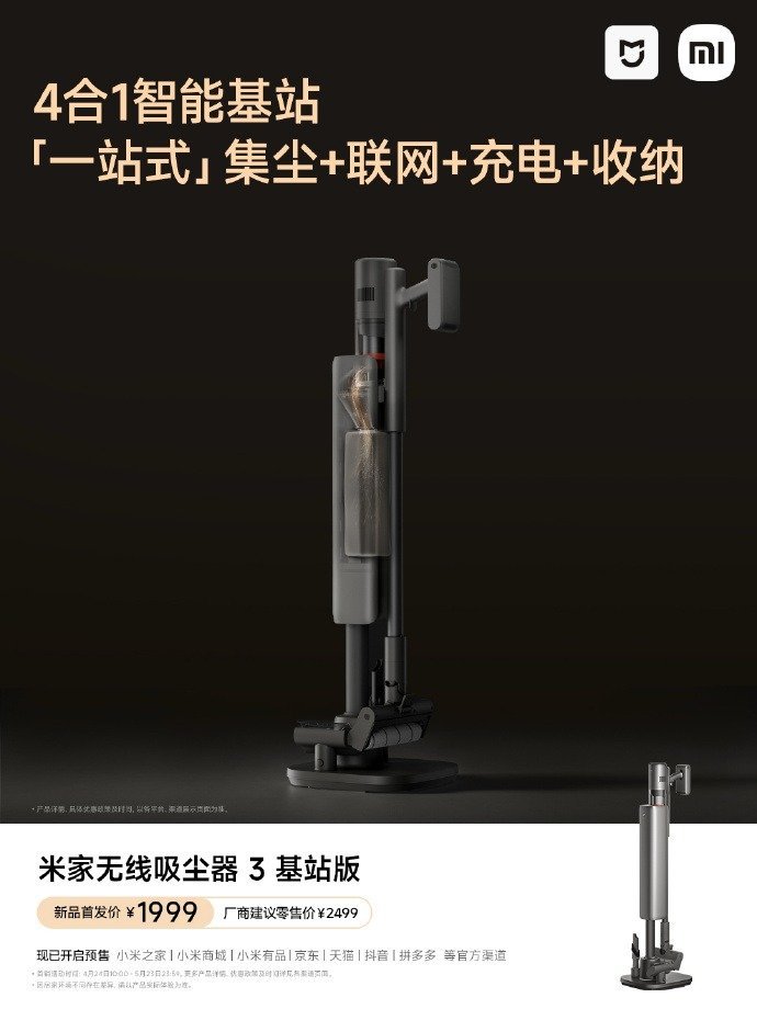 4 月 11 日,小米宣布米家无线吸尘器 3 基站版开启预售,定价 2499 元,首发预售到手价为 1999 元,是目前小米旗下定位最高端的吸尘器产品。