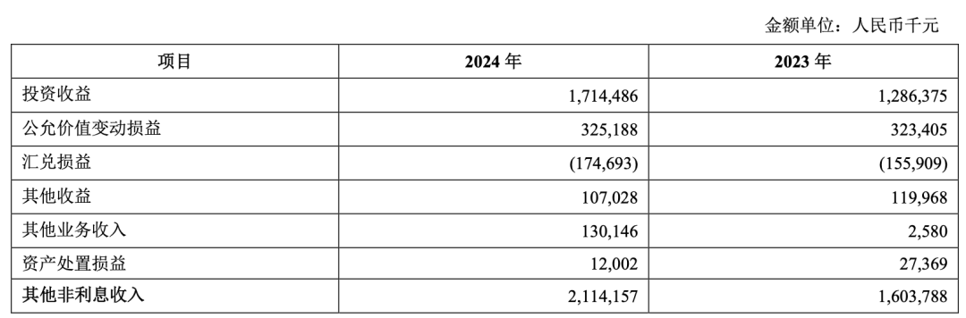 在其他非利息收入中,投资收益和公允价值变动损益20.4亿元,同比增长26.71%,其中,投资收益为17.14亿元,超上年4.28亿元,同比增长33.28%,占营收的12.70%。另外,其他业务收入1.30 亿元,比上年增加1.28 亿元,主要是销售贵金属业务收入所致。