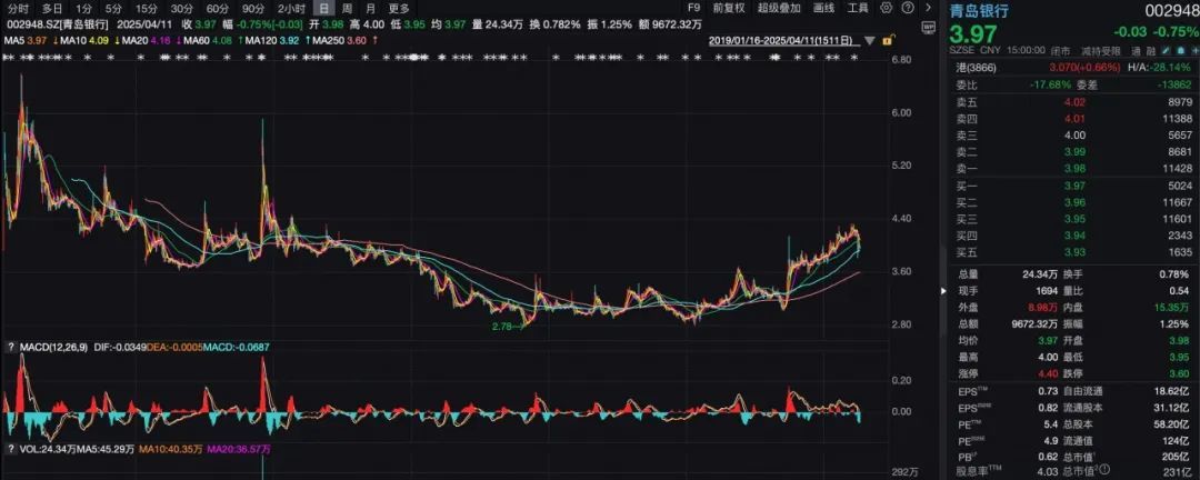 截至4月11日收盘,青岛银行的报收于3.97元/股,当日微跌0.75%,市值为231亿元。