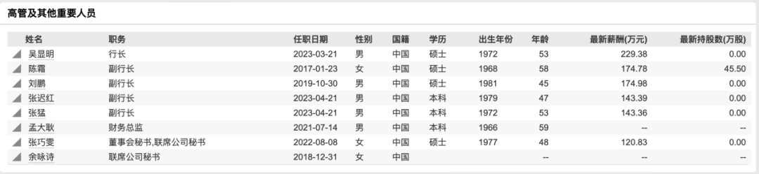 有7名董监高的年薪超100万元,分别为职工监事王大为187.76万元,副行长、执行董事陈霜174.78万元,副行长、执行董事刘鹏174.98万元,副行长张迟红143.39万元,副行长张猛143.36万元,董事会秘书张巧雯120.83万元,原监事长、原职工监事杨峰江122.80万元。