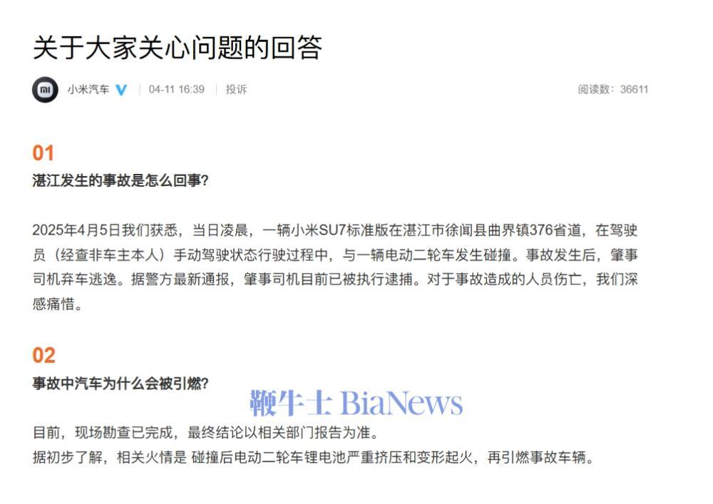 4月11日,针对网传广东湛江一小米SU7撞到两少年逃逸后起火焚毁一事,小米汽车刚刚作出了回应。