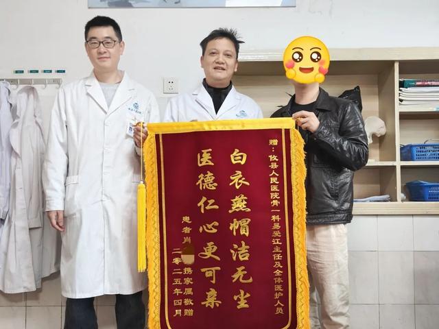 肖女士及其家属对手术效果非常满意,还特意赠送了一面金丝红布的锦旗,以表达他们对骨一科医护人员精湛医术和贴心照料的感激之情。
