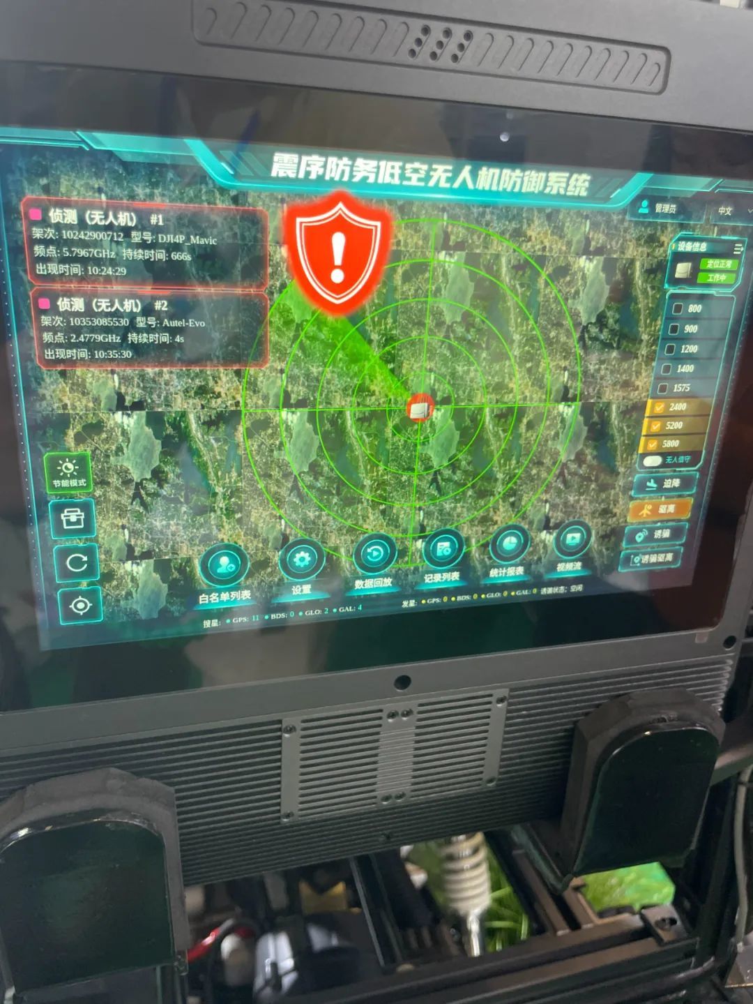“这台三合一的‘察打诱’一体的无人机反制设备,主要进行电磁干扰实现对无人机的管制。频段从800~5800兆赫兹,覆盖市场上几乎所有无人机产品都有,也就是说,非法入侵无人机是受哪一个信号的频段控制,我们就可以把那个频段控制权夺过来,进行迫降、或诱骗或打击。”