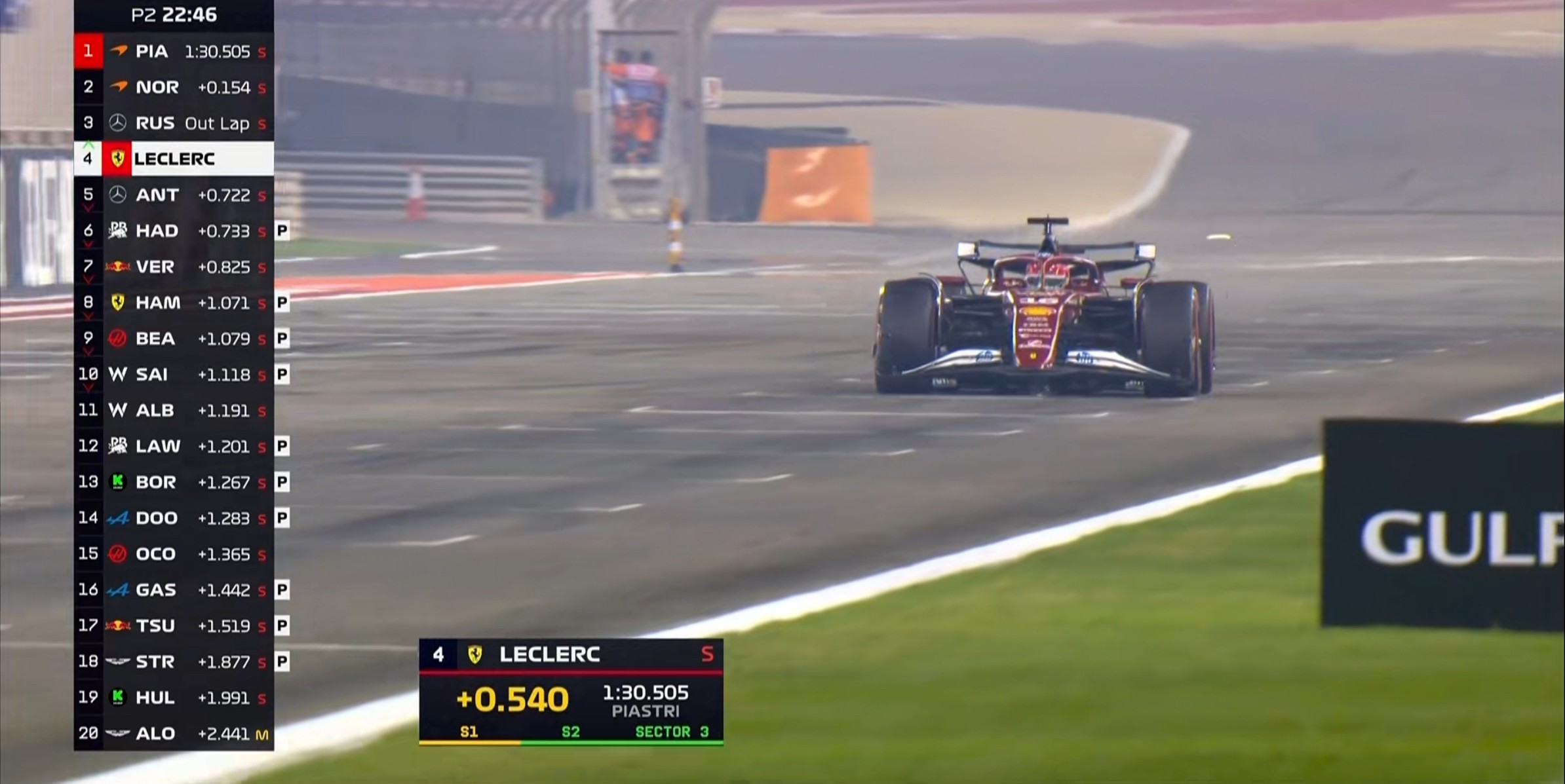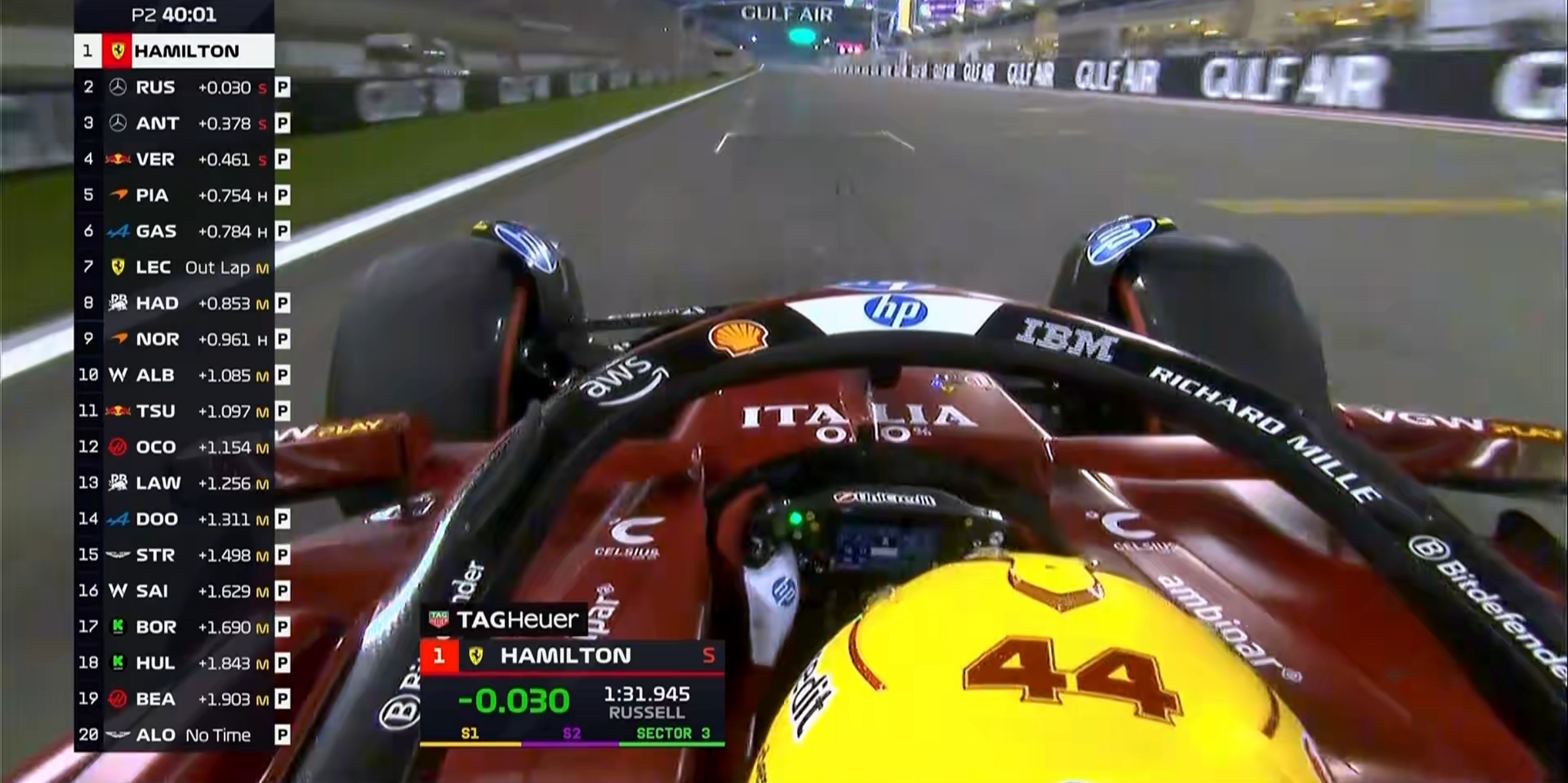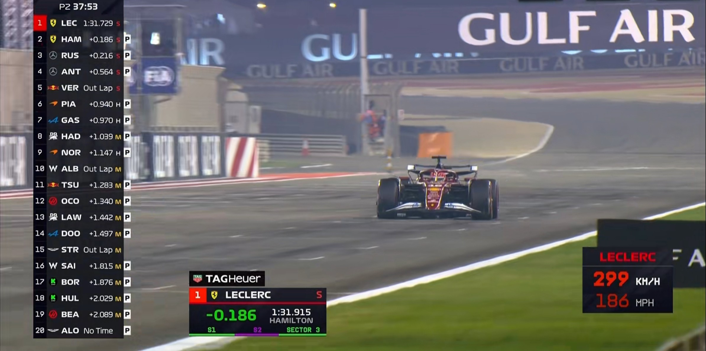 二练进行至20分钟,两台法拉利先后刷新成绩,勒克莱尔来到榜首,汉密尔顿排在第二;