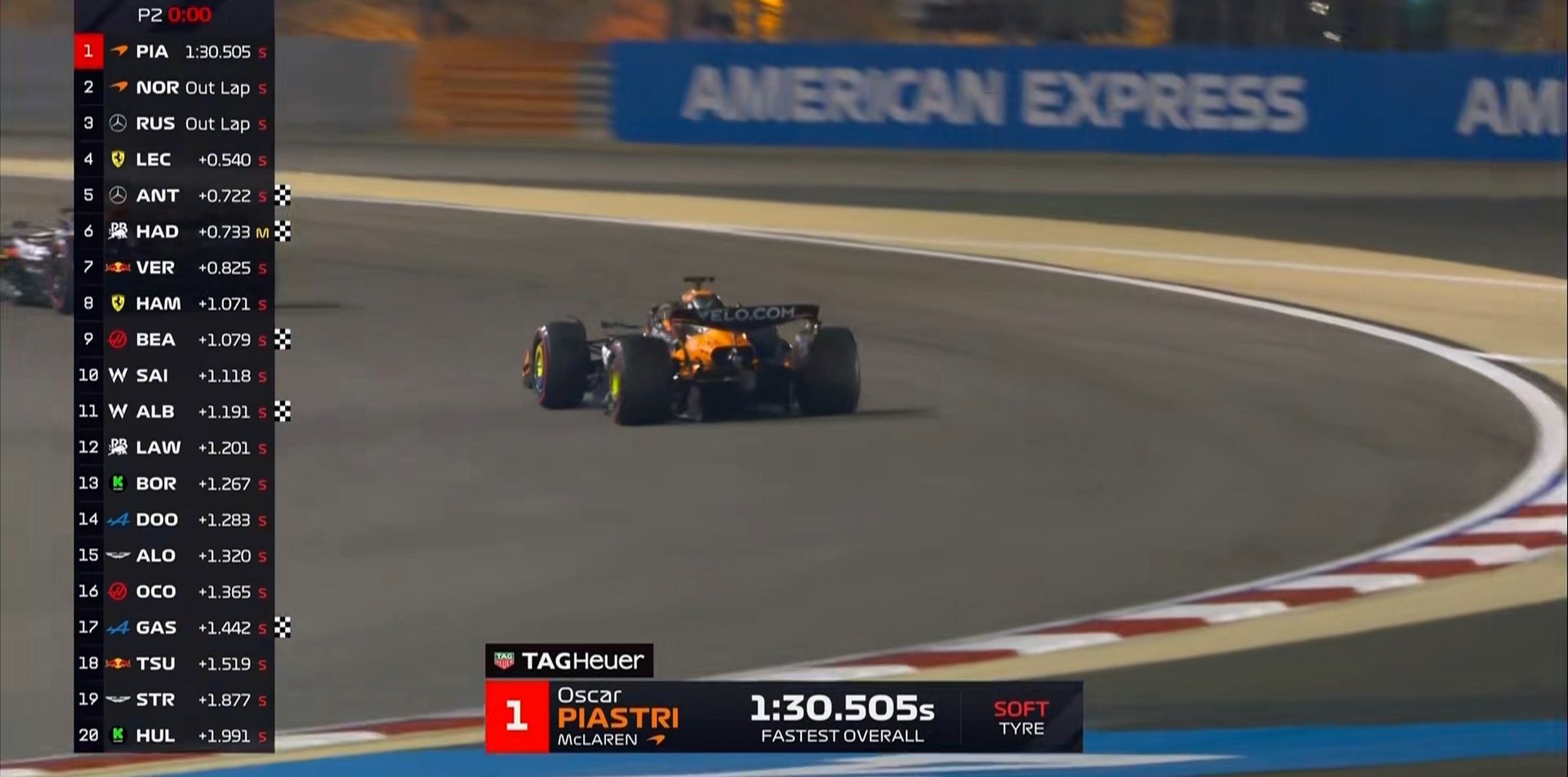 北京时间4月11日,F1巴林大奖赛第二次练习赛结束。皮亚斯特里全场最快,诺里斯、拉塞尔位居二三。勒克莱尔第4,安东内利第5,哈贾尔第6,维斯塔潘第7,汉密尔顿第8,劳森第12,角田裕毅第18。