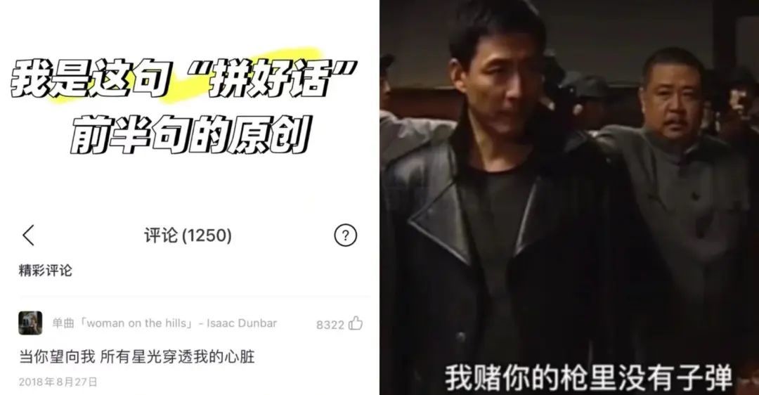 当前两句原创正主跳出来“维权”,这才终于破案,原来这是出自2018年一位初中生的网易云评论。“我赌你的枪里没有子弹”则出自抗日系列剧主角——燕双鹰的台词。