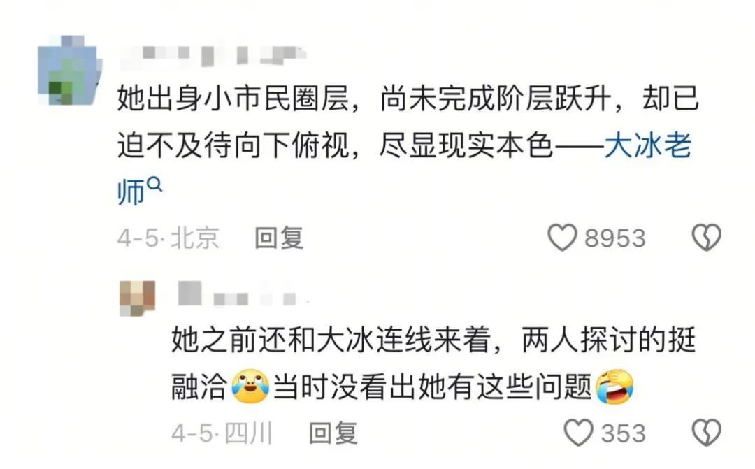 曾经,她是“草根逆袭”的代表,现在她的言行举止被认为透露出一股优越感。相关视频评论区里,随处可见复制粘贴的“大冰语录”,“她出身小市民圈层,尚未完成阶层跃升,却已迫不及待向下俯视,尽显现实本色”,正是某些网友不满情绪的释放。
