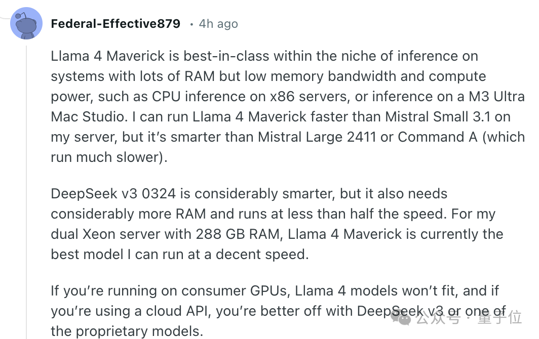 有自己假设服务器的开发者分享经验,认为Llama 4 Maverick内存充足但内存带宽和计算能力较低的系统(例如x86服务器上用CPU推理,或在M3 Ultra Mac Studio上推理)时速度比Mistral Small 3.1更快,同时比Mistral Large 2411或 Command A更智能。