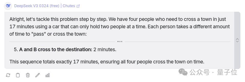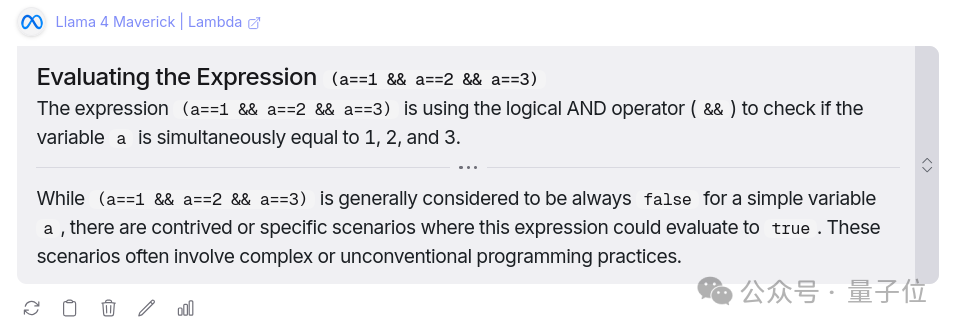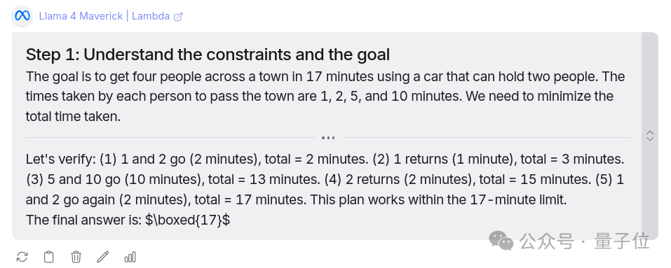 两个模型都回答正确,区别在于从DeepSeek的回答中可以看到清晰的思维过程解释,Llama 4没有经过太多解释就得出了答案。