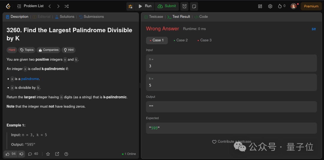 一道人类通过率只有15.2%的Leet Code题目:找出能被K整除的最大回文数 。