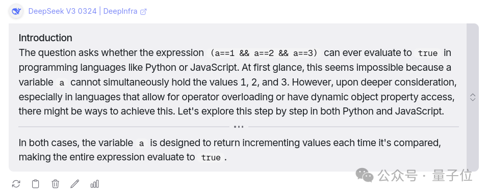 两个模型都回答正确,不过DeepSeek有惊喜,主动给出了Python和JavaScript语言的可运行代码示例,甚至作者还从中学到了之前不会的JavaScript技巧“动态对象属性访问”。