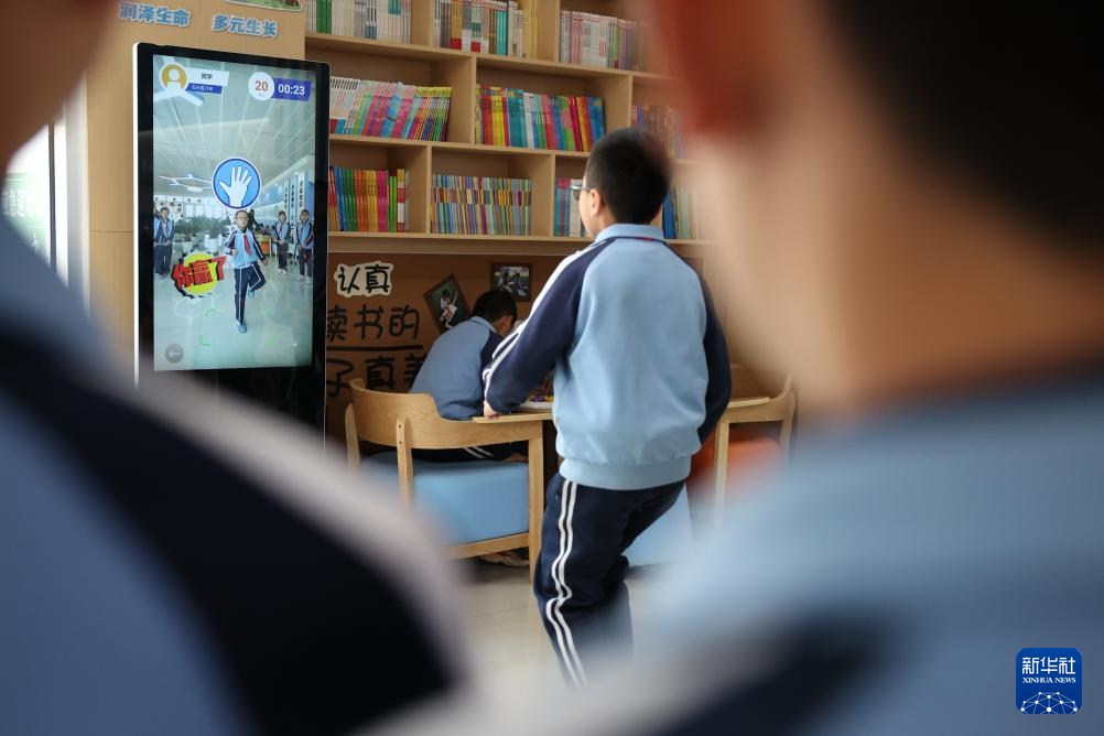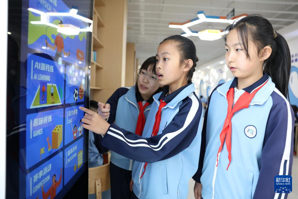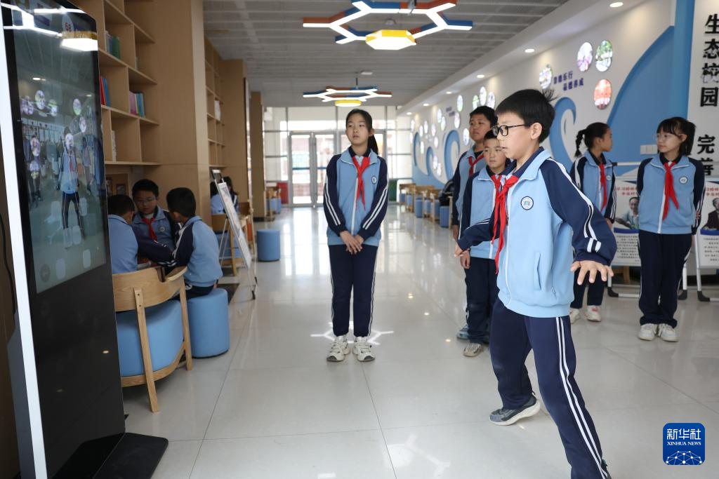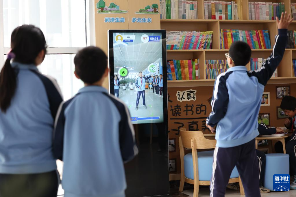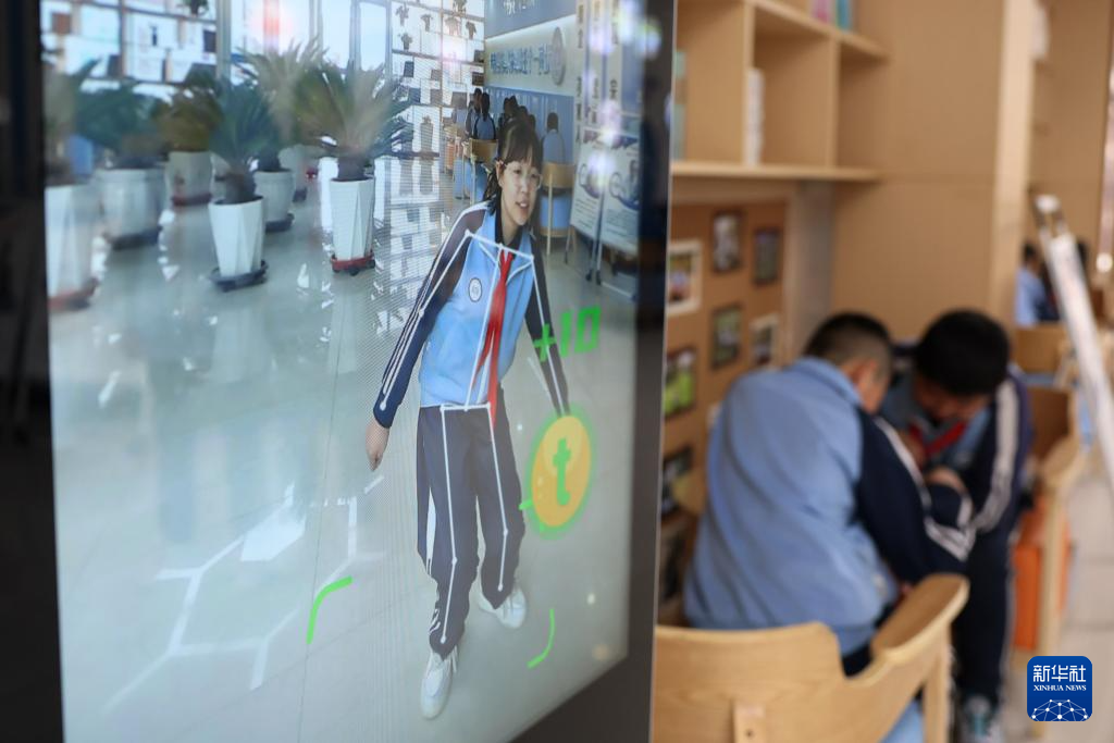 这是学生在学校的室内“AI运动小站”进行课间活动(4月11日摄)。