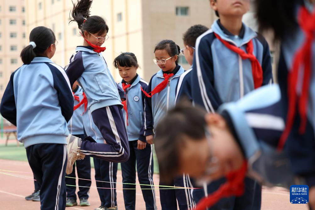 这是学生课间在操场上跳皮筋(4月11日摄)。