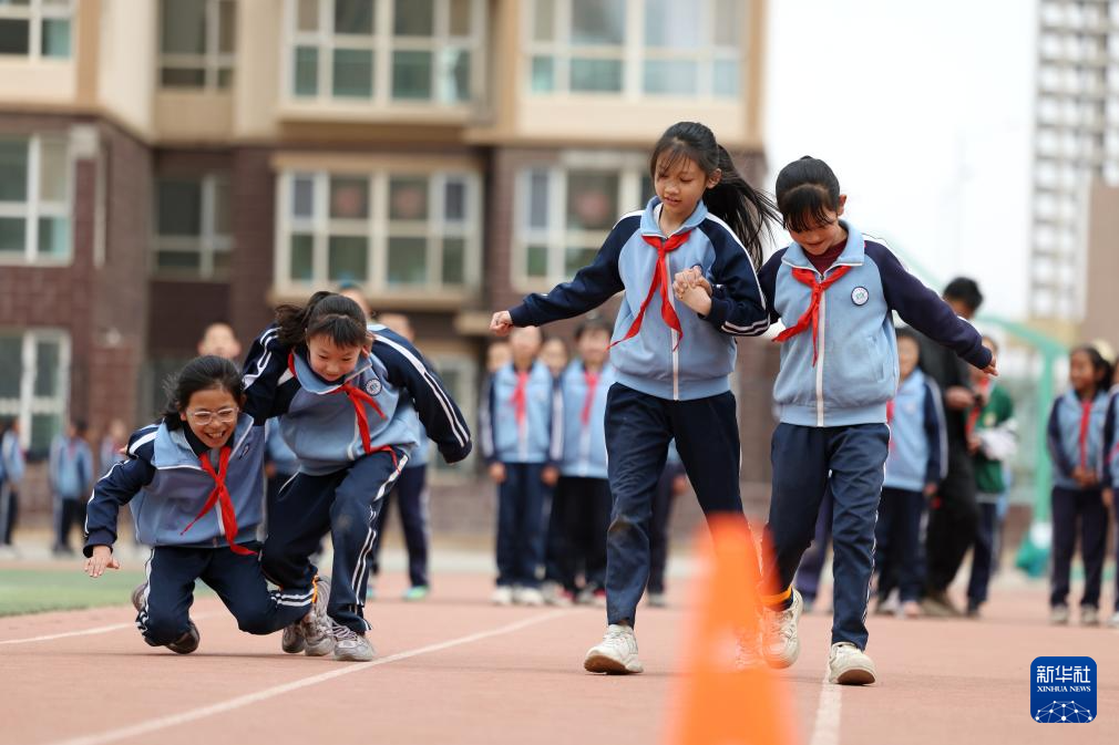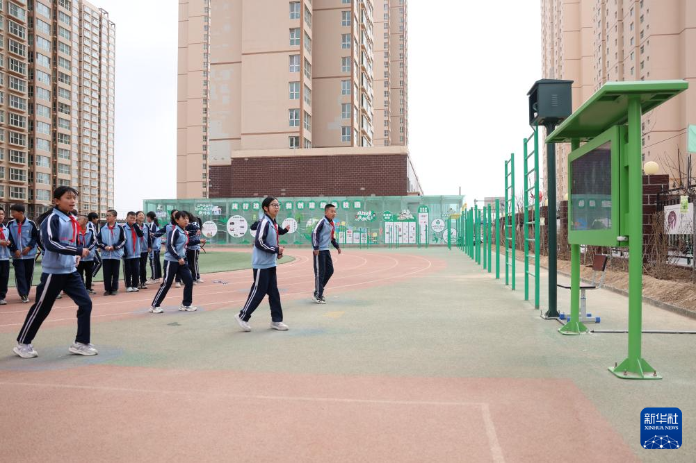 这是学生在操场上的“AI运动小站”进行课间活动(4月11日摄)。