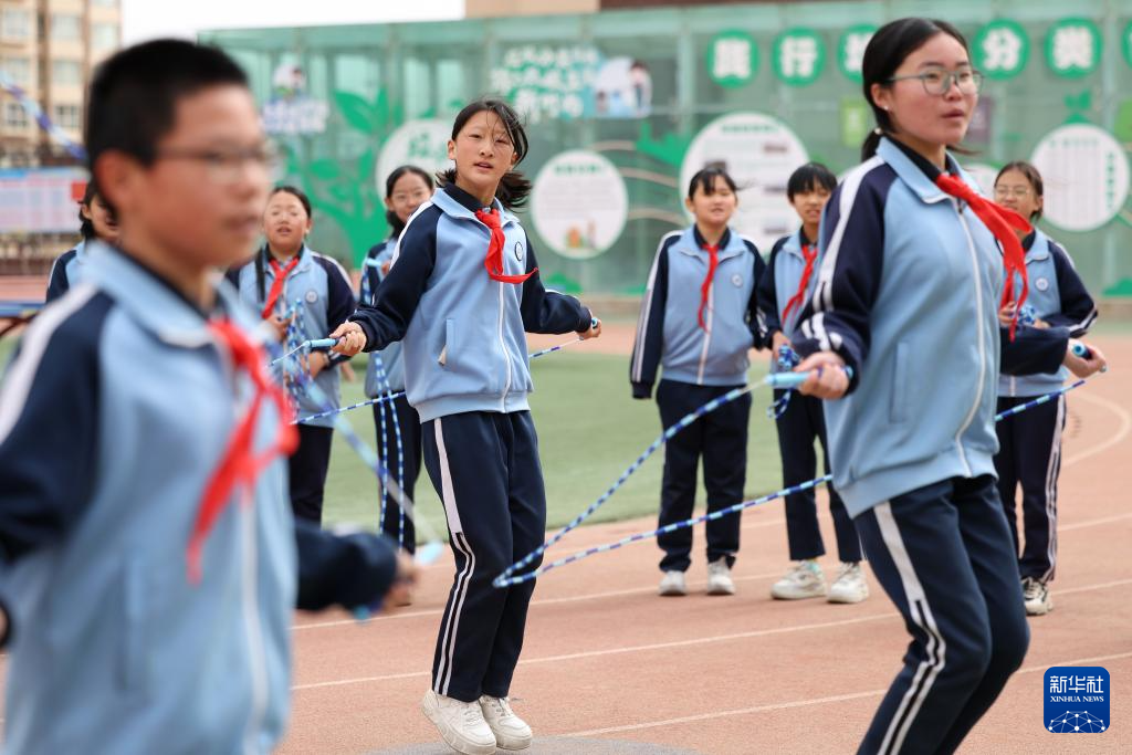 这是学生在操场上的“AI运动小站”练习跳绳(4月11日摄)。