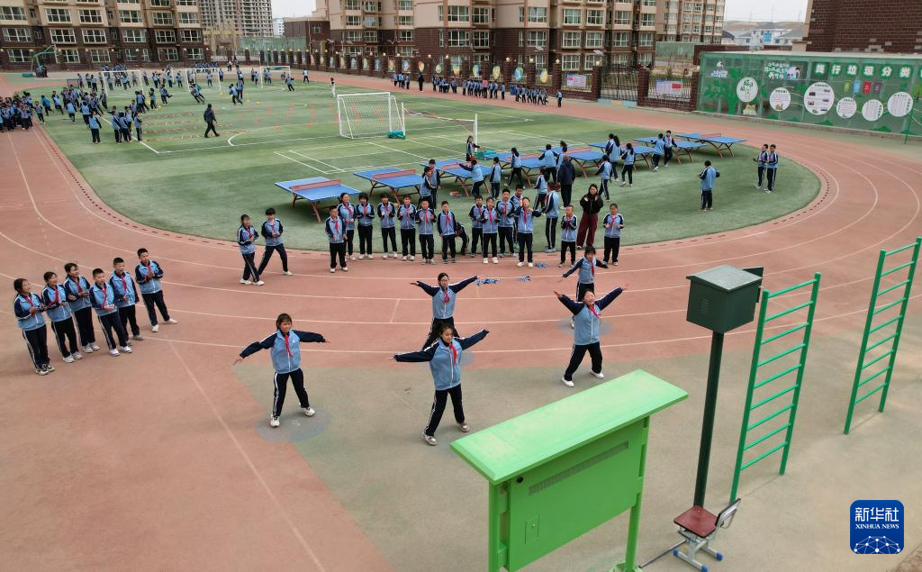 这是学生在操场上的“AI运动小站”进行课间活动(无人机照片,4月11日摄)。