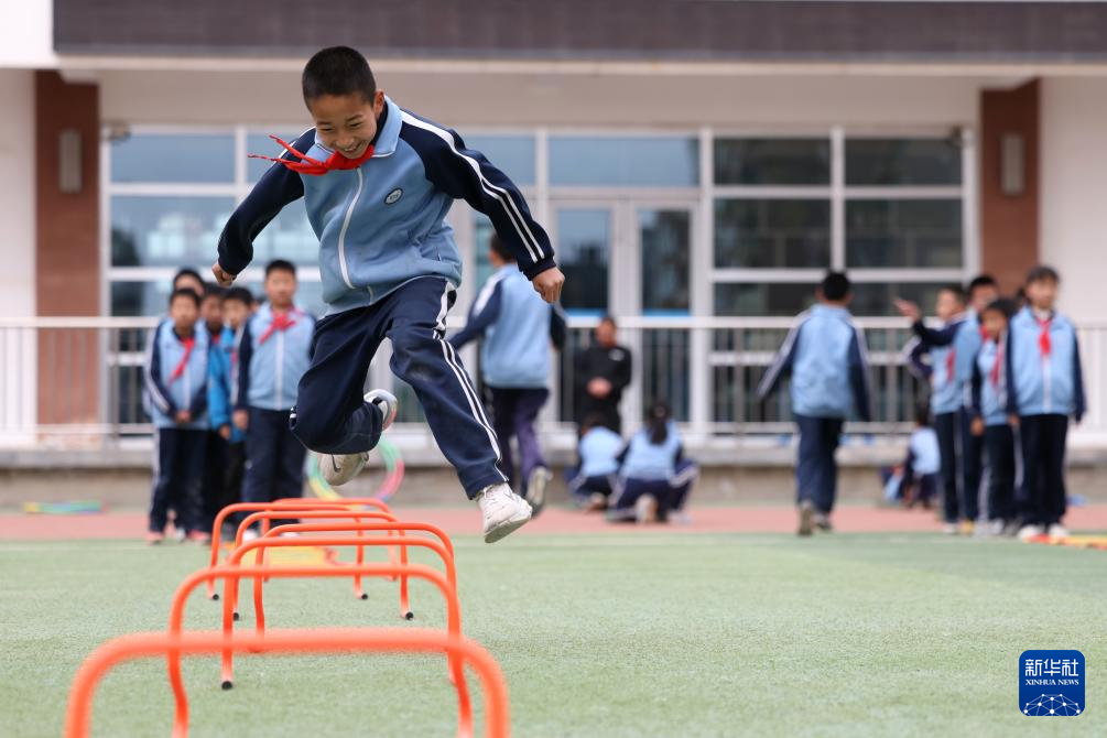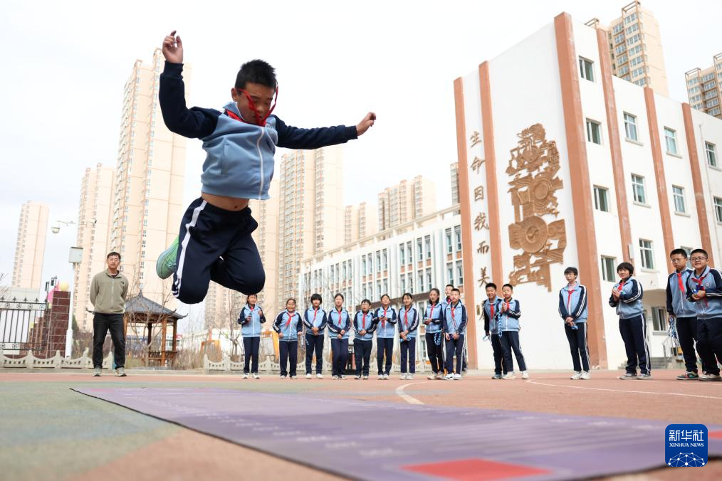 这是学生在操场上的“AI运动小站”练习开合跳(4月11日摄)。