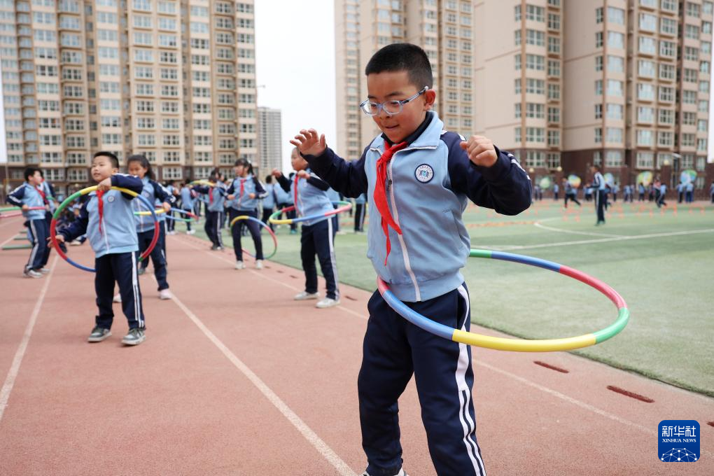 这是学生课间在操场上玩呼啦圈(4月11日摄)。