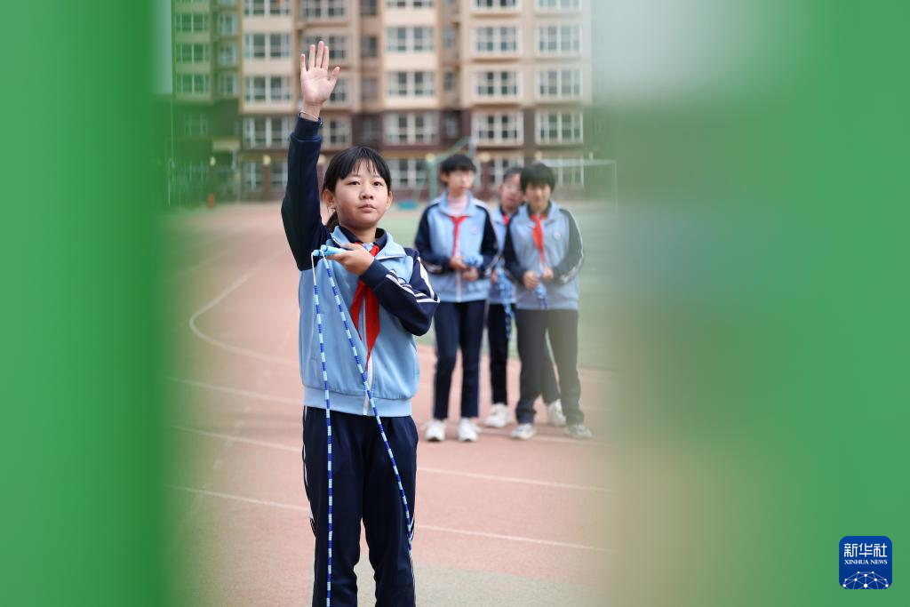 这是一名学生在操场上的“AI运动小站”面对摄像头举手示意做好跳绳准备(4月11日摄)。