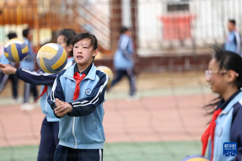 这是学生课间在操场上打排球(4月11日摄)。