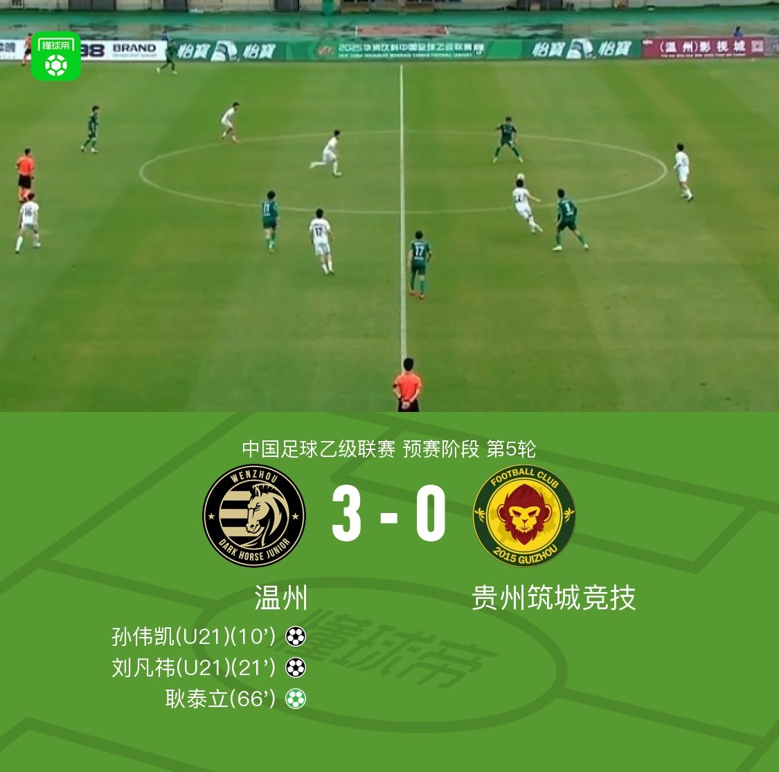 北京时间4月12日,中国足球乙级联赛预赛阶段第5轮,温州主场迎战贵州筑城竞技。比赛中,孙伟凯率先建功为温州取得领先,随后刘凡祎扩大比分优势。此后,耿泰立通过点球机会再下一城,锁定胜局。最终,温州以3-0战胜贵州筑城竞技。