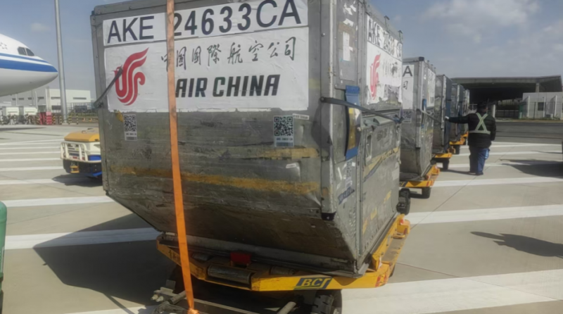 大兴机场工作人员有序摆放旅客行李,使用网罩进行加固防护。作者:首新地服公司 马征